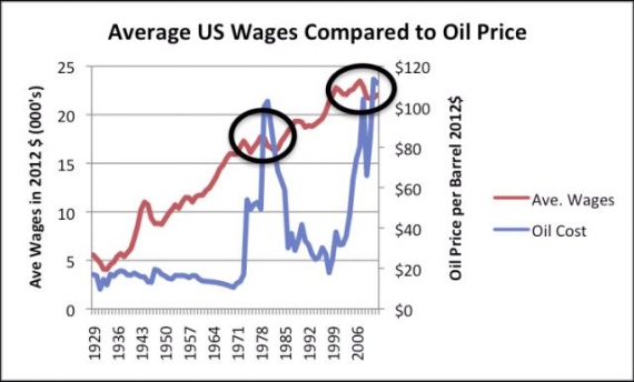 - Na koszt produkcji dóbr i usług składają się przede wszystkim płace, koszty energii (wyłączając ludzką pracę) i finansowe. Wzrost rachunków za energię skutkuje obniżką płac i stóp procentowych (od stóp procentowych zależy koszt finansowy). Wynika to z faktu, że przedsiębiorcy muszą utrzymać całkowity koszt dóbr i usług na mniej więcej stałym poziomie, inaczej konsumentów nie byłoby na nie stać, bo za wzrostem cen energii nie idzie podwyżka płac. W rzeczywistości presja, by utrzymać niski koszt produkcji, sprawia, że za podwyżką cen ropy idzie obniżka wynagrodzeń (np. w postaci przeniesienia produkcji do kraju o niższych kosztach) oraz spadek stóp procentowych.