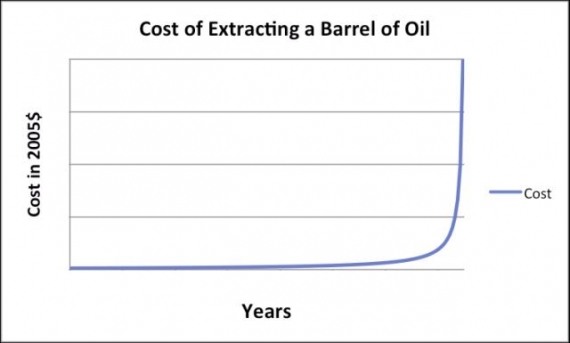 Wydobywając surowce, najpierw sięgamy po najłatwiejsze (czyli najtańsze). Siłą rzeczy, z czasem musi maleć energetyczny zwrot na inwestycji (czyli ilość energii wydobytej w stosunku do zainwestowanej). Inaczej rzecz ujmując, im więcej surowców wydobywamy, tym większym kosztem je wydobywamy – chodzi tu o ilość zaangażowanych zasobów, w tym energii i ludzkiej pracy. Ta opłacalność nie spada równomiernie. Zazwyczaj, po długim okresie powolnego wzrostu kosztów, następuje ich gwałtowna eskalacja – wtedy, kiedy zasób zaczyna się wyczerpywać.