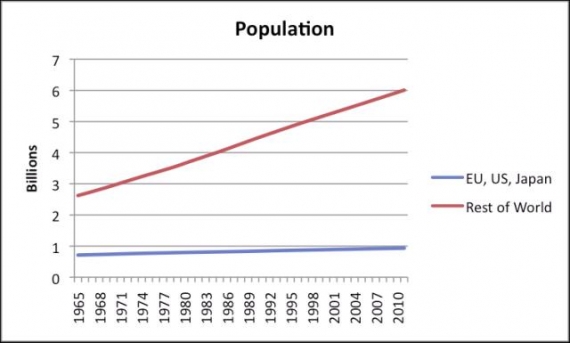Rys. 4. Ludzka populacja w rozbiciu na USA, EU-27 i Japonię oraz resztę świata.