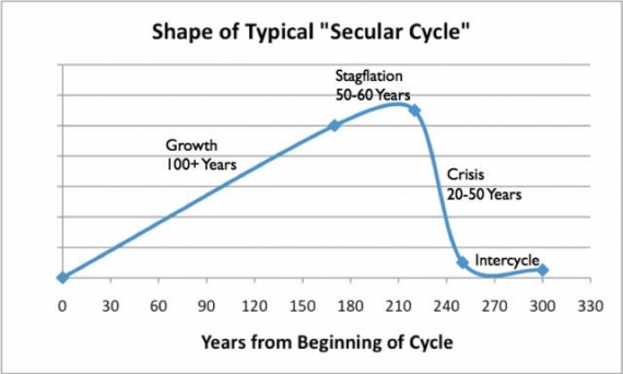 Rys. 6. Krzywa typowego cyklu sekularnego. Źródło: Peter Turchin, Sergey Nefedov, Secular Cycles.