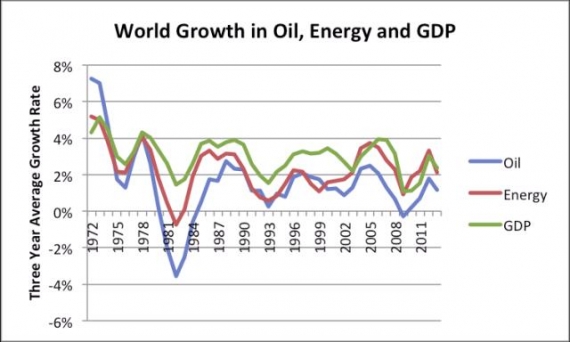 Rys. 8. Porównanie średniego trzyletniego wzrostu światowego realnego PKB (w oparciu o stałą wartość dolara USA z 2005 r.), podaży ropy i zużycia energii. Dane dla ropy i energii pochodzą z Przeglądu statystycznego zasobów i zużycia energii BP 2014.