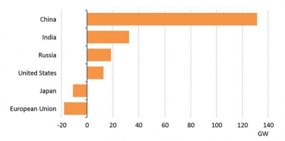Obecnie liczba działających reaktorów jądrowych spadła z 427 w lipcu 2013 roku do 388 rok później. Jak widać na rysunku powyżej, poza Japonią i Unią Europejską, w których moc elektrowni jądrowych spadnie, Chiny, Indie i Rosja planują łącznie ok. 200 GW nowych mocy.