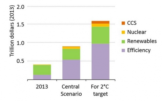 Zdaniem MAE utrzymanie globalnego wzrostu temperatury poniżej 2°C wymagać będzie zainwestowania 300 mld dolarów w energetykę odnawialną i 1000 mld dolarów w efektywność energetyczną, a także ogólnoświatowego ograniczenia emisji CO2 o jedną czwartą.