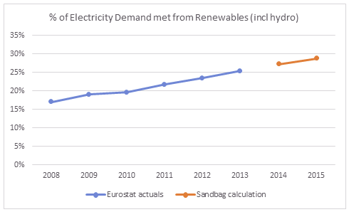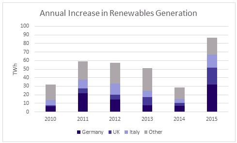 Europejski system elektroenergetyczny wchodzi na drogę znaczącej przebudowy w kierunku odnawialnych źródeł energii. Według Przeglądu Europejskiego Sektora Energetycznego, bazującego na danych Eurostatu do 2013 roku i najnowszych źródeł takich jak ENTSO-E, wzrost ilości energii odnawialnej (z pominięciem energii wodnej) wytworzonej w Unii Europejskiej był największy w historii i wyniósł 87 TWh. Największy wzrost miał miejsce w Niemczech, Wielkiej Brytanii i Włoszech.
