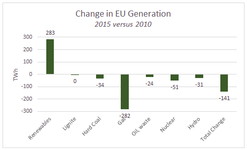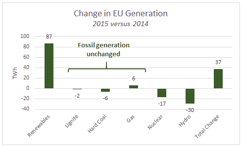 Jednak wzrost generacji z OZE nie powoduje jak na razie istotnego spadku ilości prądu wytwarzanego z paliw kopalnych, która w związku ze wzrostem zapotrzebowania i spadku generacji z elektrowni wodnych (fluktuacje związane z pogodą) i jądrowych (to część trendu) utrzymała się w 2015 roku na prawie niezmienionym poziomie. Lekko spadło zużycie węgla kamiennego i brunatnego, wzrosło zaś zużycie gazu.