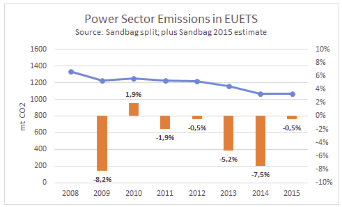 Długoterminowe trendy poprawy efektywności energetycznej i wzrostu ilości energii wytwarzanej z OZE wywierają dwustronną presję na generację z elektrowni cieplnych. Jednak emisje CO2 nie spadają tak szybko, jak miano nadzieję. Zamiast spadku emisji z najbrudniejszego paliwa – węgla, spadało wykorzystanie droższego od niego gazu (choć mający ostatnio miejsce spadek cen gazu może zmienić ten trend). Wyższe ceny uprawnień do emisji przesunęłyby balans opłacalności ekonomicznej od elektrowni węglowych do gazowych. Gdyby zamiast spadku generacji prądu z gazu nastąpił taki sam spadek ilości prądu wytwarzanego w elektrowniach węglowych, emisje z elektrowni w UE byłyby w 2015 roku o 15% mniejsze niż były.