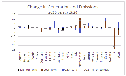 Największy spadek zużycia węgla miał miejsce w Wielkiej Brytanii, w której ilość prądu wytwarzanego w elektrowniach węglowych spadła o ponad 20 TWh. Zostało to częściowo skompensowane przez Holandię i Hiszpanie, gdzie elektrownie węglowe wyprodukowały po kilka TWh więcej.