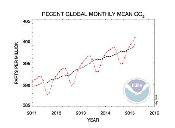 Przekroczenie stężenia 400 ppm to sytuacja bez precedensu w najnowszej historii Ziemi. I nie chodzi tu tylko o okres pomiarów prowadzonych od 1958 roku na Mauna Loa, lecz o skalę milionów lat! Według NOAA (Amerykańskiej Narodowej Służby Oceanicznej i Meteorologicznej) w marcu 2015 roku 400,83 ppm było średnią dla całej planety. I tak wartości ponad 400 ppm stały się kolejno średnią planetarną dla kwietnia i maja. I staną się nią także dla czerwca. Potem w lipcu – w związku z wegetacją – stężenie CO2 spadnie poniżej 400 ppm, ale już w grudniu, lub listopadzie 2015 roku, osiągnie ponownie 400 ppm, a potem wartość tę przekroczy. W 2016 roku poziom 400 ppm będzie już średnią światową przez cały rok.