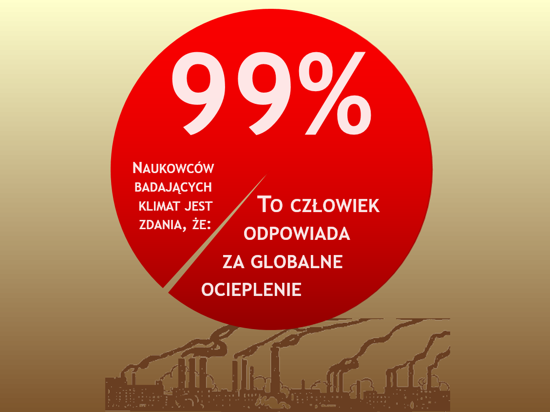 Ilustracja 1: Grafika pokazująca 99-procentowy udział naukowców aktywnie publikujących w zakresie nauki o klimacie, którzy są zgodni, że człowiek odpowiada za globalne ocieplenie.