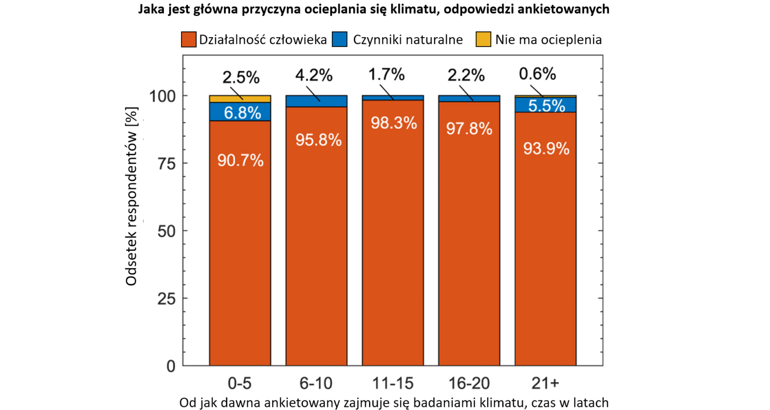 Autorzy badania przyjrzeli się też, jak opinie badanych zależą od poziomu wiedzy specjalistycznej z zakresu nauk o klimacie. Wiele badań wykazało, że im jest on większy, tym większe prawdopodobieństwo, że naukowiec zgadza się z panującym konsensusem. Niezależnie od tego, jakiej miary użyto do ilościowego określenia specjalizacji (liczba lat spędzonych na badaniu klimatu, liczba opublikowanych prac na temat klimatu i itp.), widoczny był ten sam wzór: im większa wiedza, tym częstsze było zrozumienie odpowiedzialności człowieka za globalne ocieplenie.