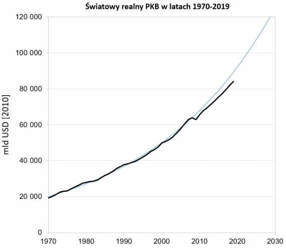 Ilustracja 1. Światowy PKB skorygowany o inflację (czyli tzw. rzeczywisty PKB, w odróżnieniu od nominalnego PKB, niekorygowanego o inflację), wyrażony w dolarach amerykańskich z 2010 roku. W latach 1970-2019 światowy rzeczywisty PKB wzrósł ponad czterokrotnie (linia czarna) co w dużym przybliżeniu odpowiada trendowi opisanemu funkcją wykładniczą, rosnącą o 3,1% rocznie (linia niebieska). Do 2008 roku obie linie – rozmiar światowej gospodarki i krzywa wykładnicza praktycznie się pokrywają. Uwagę zwraca „ząbek” na krzywej wzrostu PKB – wielki kryzys z 2008 roku.