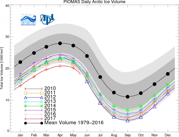 Rysunek 1. Objętość lodu w Arktyce w 2017 roku względem wartości z ostatnich lat i średniej 1979-2016. PIOMAS
