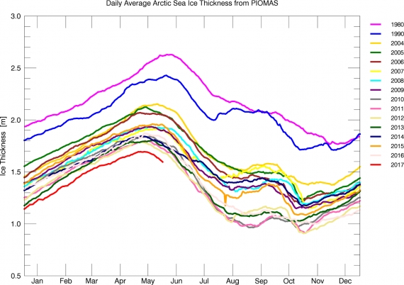 Animacja z danych map PIOMAS przedstawia zmiany w grubości lodu morskiego między 30 kwietnia a 31 maja 2017. Na dużym obszarze wzdłuż wysp Archipelagu Arktycznego spadła grubość lodu. Jest on usuwany z Arktyki przez leżące po obu stronach Grenlandii cieśniny Frama i Naresa oraz wypychany przez wiatr na Morze Beauforta.