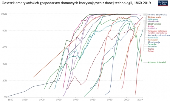 Ilustracja 3: Udział gospodarstw domowych w USA wykorzystujących różne technologie. Źródło OurWorldInData