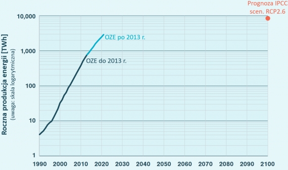 Ilustracja 4: Prognoza RCP2.6 z 5 raportu IPCC w 2013 r. a zmiany mocy OZE (bez energetyki wodnej). Źródło: RetxinkX