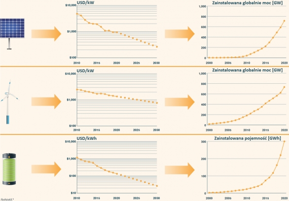 Ilustracja 5: Po lewej zmiany kosztu (dla fotowoltaiki i wiatru w USD za kW, dla baterii w USD/kWh pojemności). Po prawej skala instalacji (dla fotowoltaiki i wiatru w GW, dla baterii w GWh). Źródło: RetxinkX
