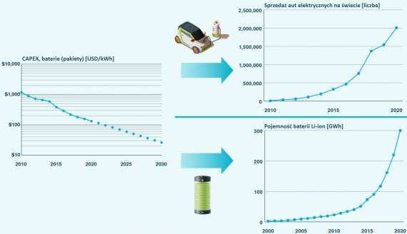 Ilustracja 6: Szybki spadek kosztu baterii (po lewej) wpływa na rozpowszechnianie się pojazdów elektrycznych i wzrost pojemności baterii (po prawej). Źródło: RetxinkX