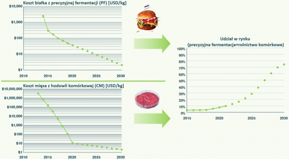 Ilustracja 7: Szybki spadek kosztu białka z precyzyjnej fermentacji (PF) oraz mięsa z hodowli komórkowej wpłyną na ich rozpowszechnianie się w miejsce dotychczasowych produktów odzwierzęcych. Źródło: RetxinkX