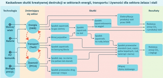 Ilustracja 8: Kreatywna destrukcja transformacji w sektorach energii, transportu i żywności prowadzi do redukcji emisji w sektorze hutniczym. Źródło: RetxinkX