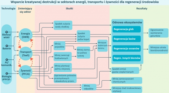 Ilustracja 10: Kreatywna destrukcja transformacji w sektorach energii, transportu i żywności prowadzi do licznych korzyści środowiskowych. Źródło: RetxinkX