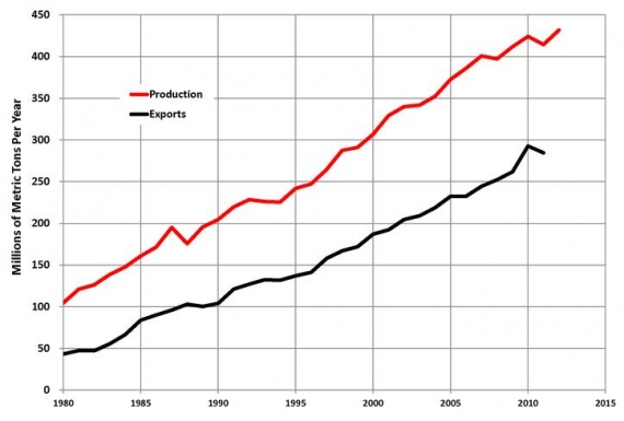 Rysunek 2. Górnictwo węglowe w Australii, czarna linia – eksport, czerwona linia – wydobycie Źródło: Wikipedia