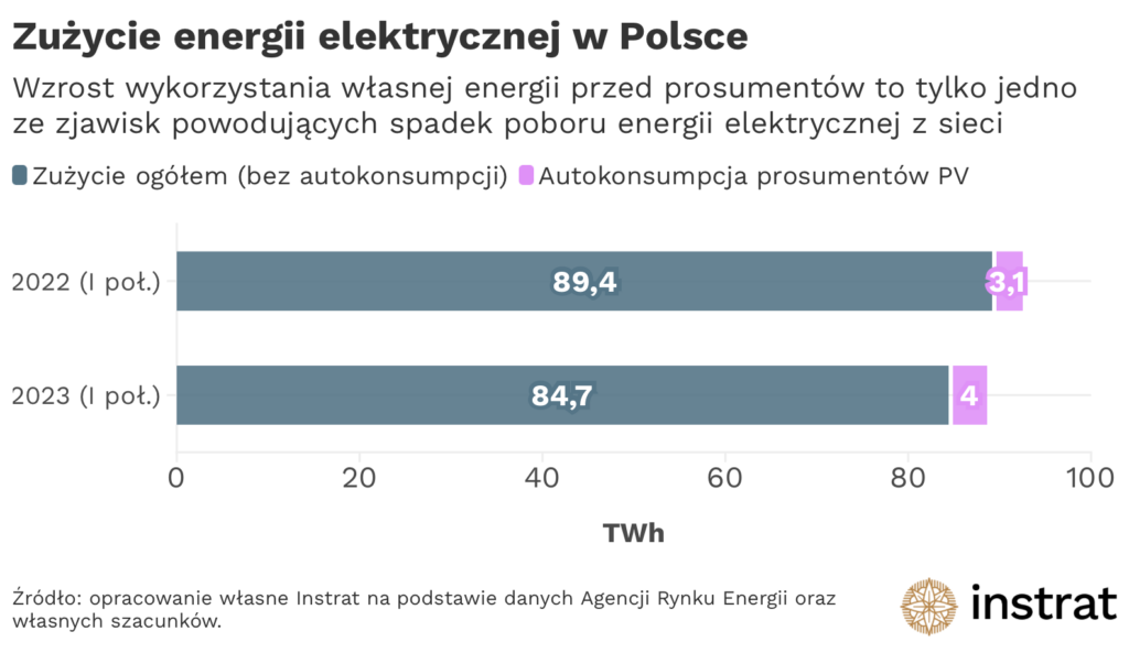 „Wzrost mocy instalacji prosumenckich w 2022 i 2023 roku nie tłumaczy spadku zużycia prądu przez odbiorców. Według naszych szacunków nowe instalacje prosumentów pozwoliły zwiększyć „pozasystemowe” zużycie własnej energii elektrycznej w pierwszej połowie 2023 roku tylko o niecałe 1 TWh względem poziomu rok wcześniej. W tym czasie spadek zużycia energii przez ogół odbiorców wyniósł prawie 5 TWh, a spadek produkcji w elektrowniach opalanych paliwami węglowymi o prawie 12,4 TWh” – wylicza Swoczyna.