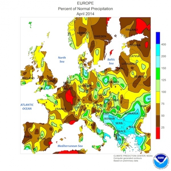 Rysunek 3. Ilość opadów w Europie w kwietniu 2014 r. Dane NOAA.
