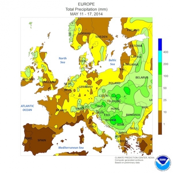 Rysunek. 1. Ilość opadów w Europie w dniach. 11-17 maja 2014 r. Dane NOAA.