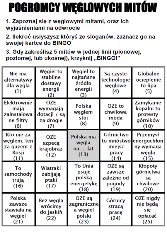 Wydrukuj je i połóż obok telewizora podczas dyskusji o węglu, albo przynieś na debatę poświęconą problemom energetyki lub górnictwa. Gdy usłyszysz, że mówca używa znajomych sloganów zaznaczaj je na kartce. Szybko zauważysz, jak często strategia obrońców węgla ogranicza się do bezrefleksyjnego powtarzania tych samych mitów.