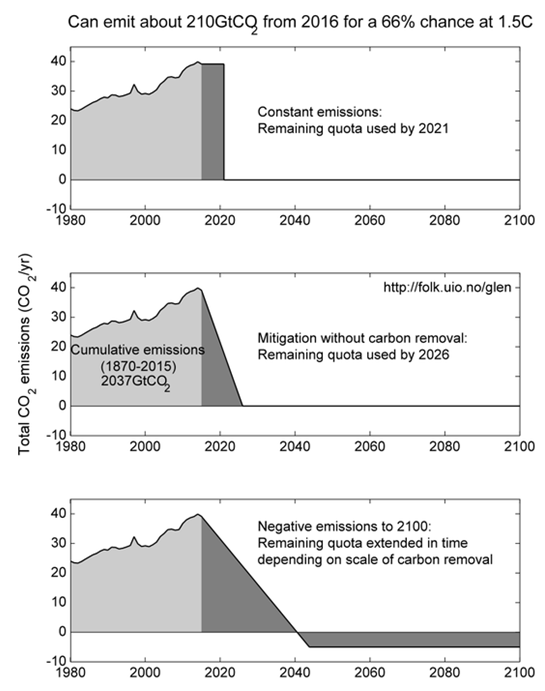 Rysunek 2. Wykres emisji CO2 w czasie. Aby z prawdopodobieństwem 66% nie przekroczyć progu ocieplenia o 1,5°C, w okresie od 2016 możemy w sumie wyemitować 210 mld ton CO2 (GtCO2). Górny panel –utrzymujemy emisje na obecnym poziomie, cały dostępny budżet emisji wyczerpujemy do 2021 roku. Środkowy panel – zmniejszamy emisje liniowo do zera w 2026 roku. Dolny panel – emisje mogą spadać wolniej w zależności od skali późniejszych „ujemnych emisji” czyli pochłaniania CO2.