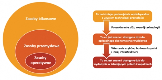 Na początek mały słowniczek pojęć. Definiujemy zasoby bilansowe paliw kopalnych (złoża istniejące, potencjalnie wydobywalne), zasoby przemysłowe (złoża dostępne, ekonomicznie opłacalne do wydobycia) oraz zasoby operatywne(złoża wydobywane w działających kopalniach i na polach naftowych). Oto pomocna infografika: