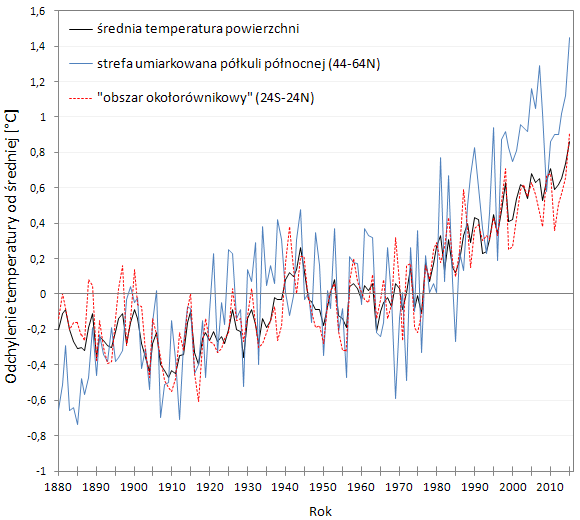 której widzimy, że strefa okołorównikowa wcale się nie ochładza lecz ociepla.