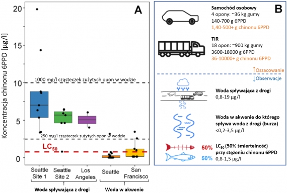 Rysunek 3. Po lewej (A): wyniki pomiarów koncentracji chinonu 6PPD w wodzie spływającej z dróg w dwóch miejscach Seattle oraz w jednym w Los Angeles oraz w dwóch strumieniach: w Seattle oraz San Francisco. Pozioma przerywana linia LC50 pokazuje stężenie chinonu 6PPD w wodzie prowadzące do śmierci połowy łososi. Po prawej (B), góra: Oszacowana ilość antyutleniacza 6PPD w oponach samochodów osobowych (140-700 g) i TIRów (3600-18000 g) oraz powstającego w tych oponach toksycznego chinonu 6PPD (od 1,4 do ponad 500 g dla kompletu opon samochodu osobowego oraz od 36 do ponad 10000 g dla kompletu opon TIRa). Po prawej (B), dół: zmierzona ilość chinonu 6PPD w wodzie spływającej z drogi wielopasmowej, wodach strumieni do których spływa woda z dróg oraz koncentracja chinonu 6PPD w wodzie powodująca 50-procentową śmiertelność łososi. Źródło Tian i in., 2020.