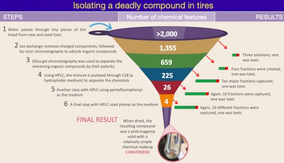 Grupa chemików i biologów z Centrum Wód Miejskich w Tacoma, Uniwersytetu Waszyngtońskiego i Uniwersytetu Stanu Waszyngton badała mieszaniny odtwarzające skład tego, co było zmywane z dróg. Okazało się, że mieszanina cząstek z opon wywoływała u ryb objawy zatrucia. A więc opony! Ale określenie tego, który konkretnie związek chemiczny jest tak bardzo toksyczny było bardzo trudne – w mieszaninie znajdowało się bowiem aż ponad 2000 substancji chemicznych. Zidentyfikowanie winowajcy zajęło całe lata.
