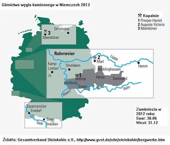 Zagłębie Ruhry to największy niemiecki region górniczy. Jak okiem sięgnąć kopalnie, koksownie, huty, elektrownie i inne zakłady przemysłowe wykorzystujące węgiel, jako pierwotne źródło energii. Od końca II wojny światowej, aż do późnych lat 50. XX wieku wydobycie węgla w Niemczech gwałtownie rosło zaspokajając zapotrzebowanie gospodarki. W roku 1950 – wydobyto w całym kraju 122 mln ton węgla, w 1954 – 144 mln ton, w 1957 – 149 mln ton, i jeszcze w 1960 142 mln to, z tego ponad 80% w zagłębiu Ruhry. Potem było już tylko gorzej. Rok 1970 – 111 mln ton, rok 1980 – 86 mln ton, rok 1990 – 69 mln ton, rok 2000 – 33 mln ton. W 2012 roku wydobyto już tylko nieco więcej niż 10 mln ton, przy zapotrzebowaniu krajowym dla potrzeb energetycznych sięgającym 60 mln ton w poprzednim roku.