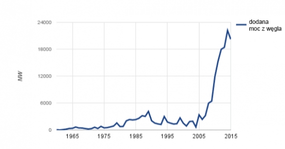 Rysunek 1. Roczny wzrost mocy z węgla, w MW, lata1960-2015 – tuż przed ogłoszeniem przez kraj nadpodaży energii z węgla (CoalSwarm)