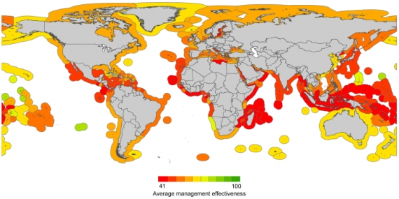 Rys. 2 Poziom skuteczności zarządzania rybołówstwem morskim na świecie. Jak widać na mapie, prawie w ogóle nie ma odcieni zielonych, co oznacza, że gospodarka morska jest zła lub fatalna. PLOS Biology