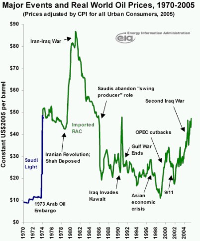 Przyjrzyjmy się zmianom cen ropy w historii (skorygowane o inflację w odniesieniu do siły nabywczej z 2005 roku). Wykres przedstawia ceny ropy dla okresu 1970-2005.
