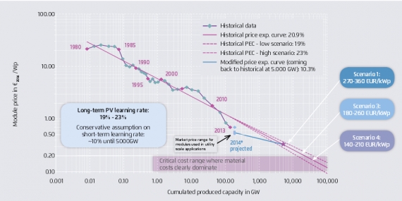 Z badań przeprowadzonych przez Fraunhofer Institute for Solar Energy Systems wynika, że do 2025r. energia słoneczna w słonecznych regionach świata może być tańsza niż energia uzyskiwana z węgla lub gazu. Sukces jest jednak zależny od stabilnych warunków prawnych i finansowych.