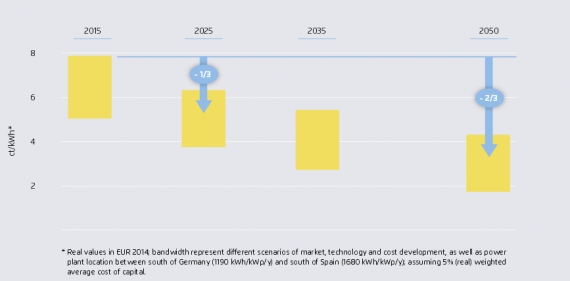 W ciągu najbliższych lat elektrownie słoneczne będą dostarczać najtańszą dostępną energię w wielu częściach świata. Badania wykonane na zlecenie niemieckiego think-tanku Agora Energiewende wskazują, że do 2025r. koszt produkcji energii w Europie centralnej i południowej będzie oscylował w granicach 4-6 centów/kWh, zaś do 2050r. spadnie do 2-4 centów/kWh.
