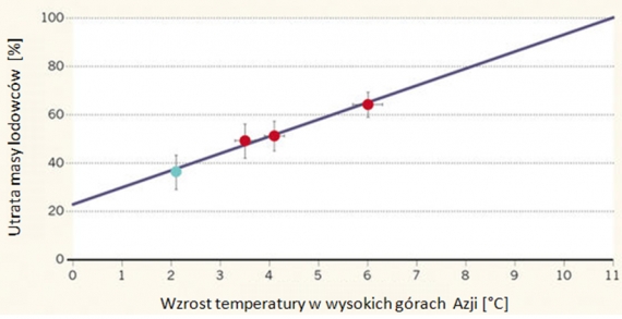 „Zatrzymanie ocieplenia poniżej 1,5oC to bezprecedensowo trudne zadanie. A nawet wtedy 36% (±7%) górskich lodowców Azji może zostać straconych już do 2100 roku”. Według opracowanych przez naukowców modeli wraz ze wzrostem temperatur lodowce będą coraz bardziej się kurczyć. Przy wzroście temperatury o 3,5-4oC stracą one ok. połowy masy, a przy 6oC aż 2/3.