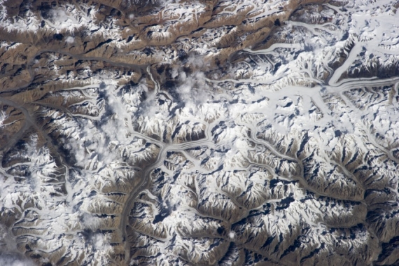 Rys. 2 Pokryte lodowcami wysokie pasma Karakorum. Wypływające z tych rzeki dostarczają wodę m.in. Pakistanowi. NASA