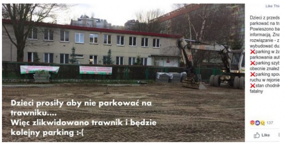 Ten zostanie zalany betonem i zamieniony w parking. Co – szukając w tym pokrętnej logiki – rzeczywiście spowoduje, że dorośli przestaną parkować na trawniku i zaczną na parkingu.