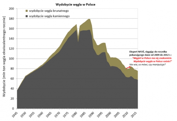 Ilustracja Wydobycie węgla w Polsce od końca II wojny światowej do 2016 roku w mln ton węgla ekwiwalentnego (o kaloryczności 29,3 GJ/t). Przyjęta kaloryczność węgla kamiennego 24 GJ/t, węgla brunatnego 8,5 GJ/t. Choć liczone w tonach ilości wydobywanego węgla kamiennego i brunatnego są porównywalne (w 2016 roku odpowiednio 70 i 60 mln ton), to blisko 3-krotnie wyższa kaloryczność węgla kamiennego zapewnia mu bezdyskusyjną dominację. Dane tutaj.