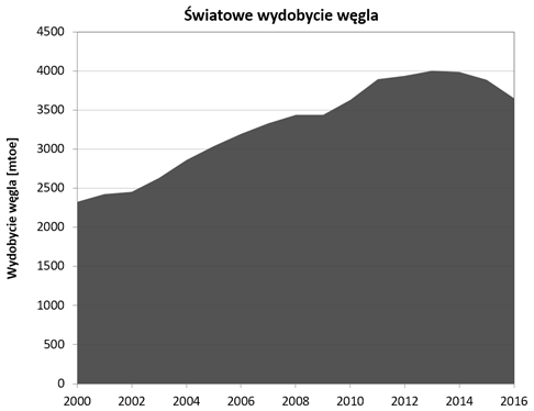 Rysunek 2. Światowe wydobycie węgla 2000-2016. Źródło: BP Statistical Review of World Energy 2017.