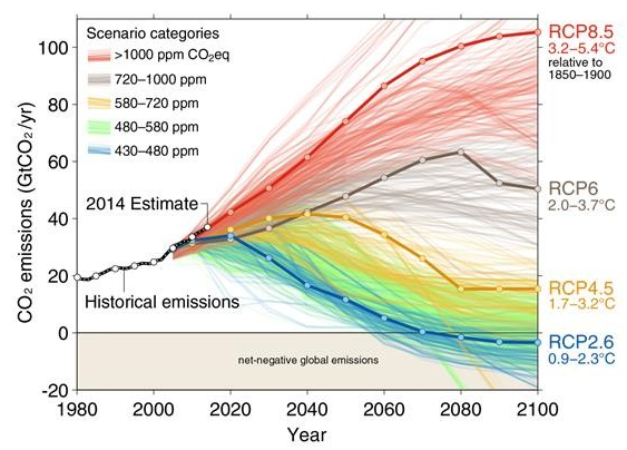 Rysunek 2: Dotychczasowe emisje dwutlenku węgla zestawione ze scenariuszami emisji z 5 Raportu IPCC. Źródło