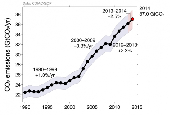 Rysunek 1: Emisje dwutlenku węgla na świecie ze spalania paliw kopalnych i produkcji cementu. Czerwona kropka oznacza prognozę na 2014 rok. Global Carbon Project