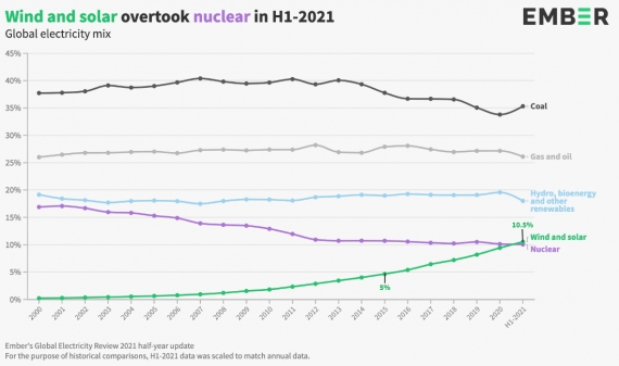 Warto przy tym odnotować, że po raz pierwszy energia wiatrowa i słoneczna wygenerowały ponad 10% energii elektrycznej na świecie (a dokładniej 10,5%), wyprzedzając przy tym energię jądrową.