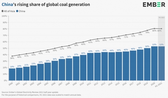 Rysunek 4: Udział Chin w globalnej produkcji energii elektrycznej z węgla. Źródło: Ember.