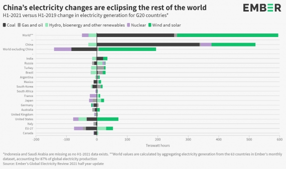 W efekcie Chiny były odpowiedzialne za 90% wzrostu zapotrzebowania na energię elektryczną w tym okresie. A że rosnące potrzeby w aż 68% zaspokojono energią z węgla, a tylko 29% z wiatru i słońca, to udział Chin w globalnej produkcji prądu z węgla wzrósł z 50 do 53%. Skalę przyspieszenia bardzo dobrze ukazuje fakt, że dodatkowe 337 TWh z węgla to więcej niż całkowita produkcja energii elektrycznej z tego źródła dla całej UE.